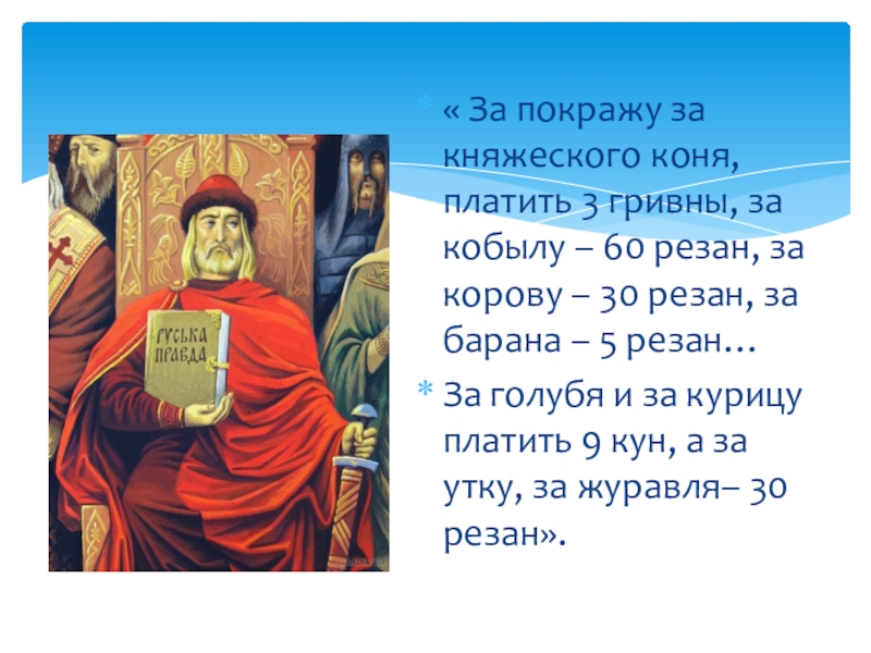 Слайд 23« За покражу за княжеского коня, платить 3 гривны, за кобылу