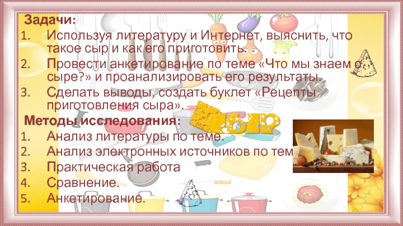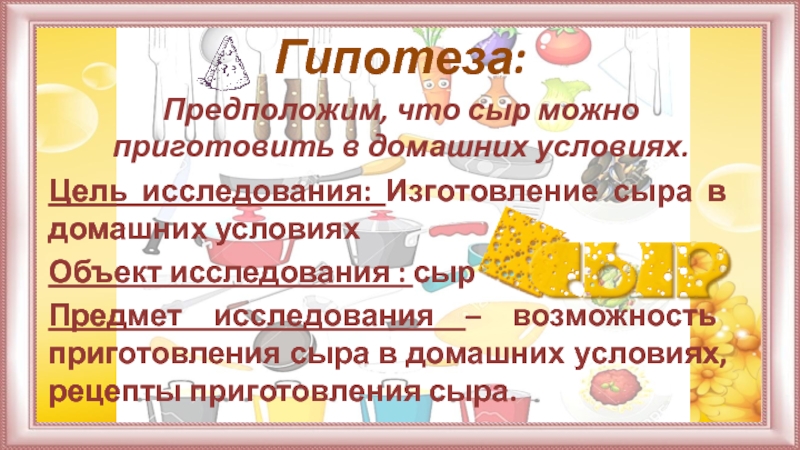 Предмет исследования – возможность приготовления сыра в домашних условиях, рецепты приготовления сыра.