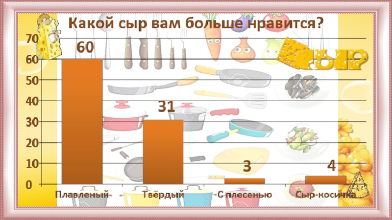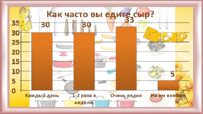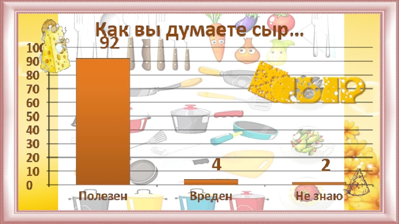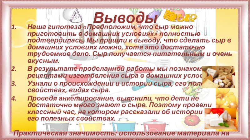 Проведя анкетирование, выяснили, что дети не достаточно много знают о сыре. Поэтому провели классный час, на котором рассказали об истории сыра, его полезных свойствах.