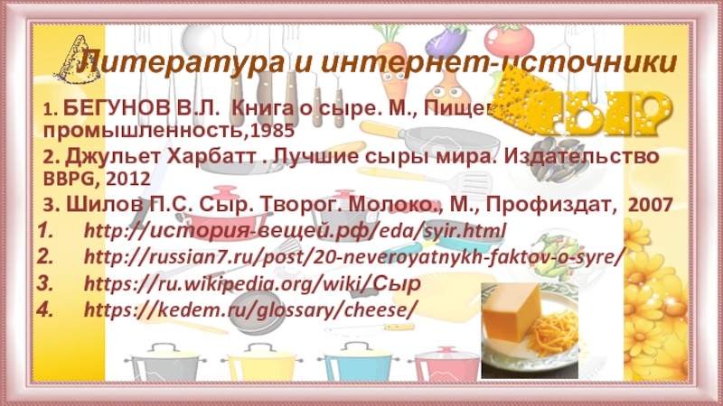 1. БЕГУНОВ В.Л. Книга о сыре. М., Пищевая промышленность,1985