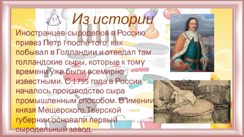побывал в Голландии и отведал там голландские сыры, которые к тому времени уже были всемирно известными. С 1795 года в России началось производство сыра промышленным способом. В имении князя Мещерского Тверской губернии основали первый сыродельный завод.