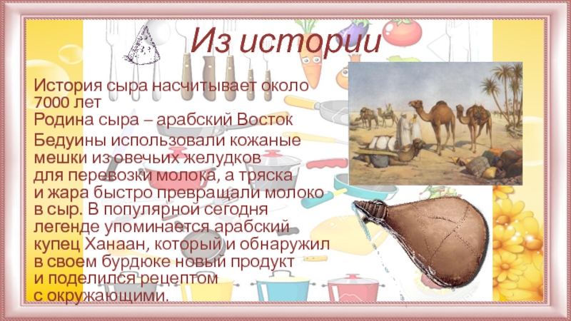 Бедуины использовали кожаные мешки из овечьих желудков для перевозки молока, а тряска и жара быстро превращали молоко в сыр. В популярной сегодня легенде упоминается арабский купец Ханаан, который и обнаружил в своем бурдюке новый продукт и поделился рецептом с окружающими.