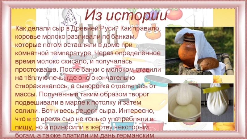 молоко разливали по банкам, которые потом оставляли в доме при комнатной температуре. Через определённое время молоко скисало, и получалась простокваша. После банки с молоком ставили на тёплую печь, где оно окончательно створаживалось, а сыворотка отделялась от массы. Полученный таким образом творог подвешивали в марле к потолку и затем солили. Вот и весь рецепт сыра. Интересно, что в то время сыр не только употребляли в пищу, но и приносили в жертву некоторым богам, а также платили им дань германским племенам.