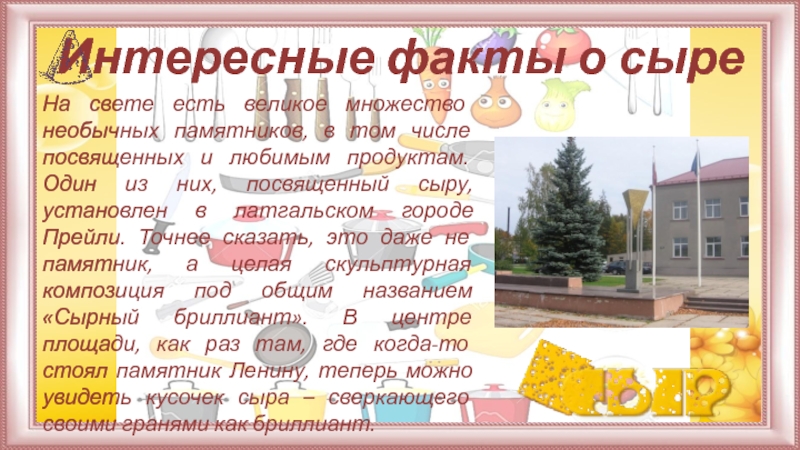 том числе посвященных и любимым продуктам. Один из них, посвященный сыру, установлен в латгальском городе Прейли. Точнее сказать, это даже не памятник, а целая скульптурная композиция под общим названием «Сырный бриллиант». В центре площади, как раз там, где когда-то стоял памятник Ленину, теперь можно увидеть кусочек сыра – сверкающего своими гранями как бриллиант.