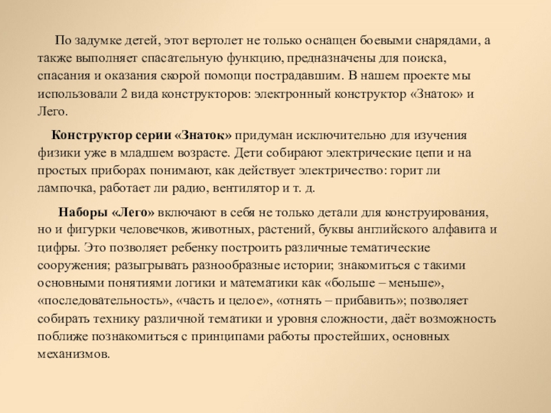 Мы также придумали историю про наш вертолет: «Вертолет относится к воздушному транспорту, который способен передвигаться по воздуху, таким транспортом управляет летчик. У нашего вертолета крыльев нет, а пропеллер расположен сверху. Он очень быстро мчится и ему не надо аэродрома. Была бы только крошечная площадка. Вертолет на нее без труда сядет и так же легко с нее взлетит. Повадки у вертолета, как у стрекозы. Летит, летит – остановится в воздухе, «повиснет», точно стрекоза. Повисит, а потом опять в путь. Ни один самолет так не может сделать.
