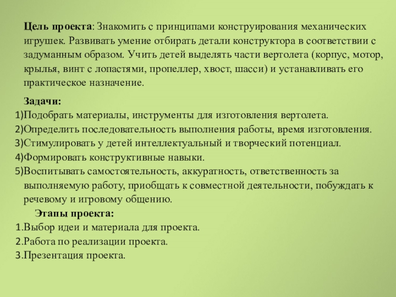 Цель проекта: Знакомить с принципами конструирования механических игрушек. Развивать умение отбирать