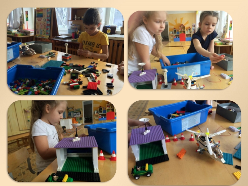 В деятельность детей входило конструирование модели вертолета, отдельных элементов, частей, дополнительных деталей (сборка Лего-человечков – пилотов, военная база вертолетов). Деятельность педагога заключалась в установке мотора и батареек внутри вертолета, и при необходимости, оказание помощи детям. Еще одним штрихом в создании вертолета является его украшение различными дополнительными деталями – антенны, габаритные огни, фары. А также создание вспомогательных элементов: люди, военная база, военные машины, грузовые автомобили.