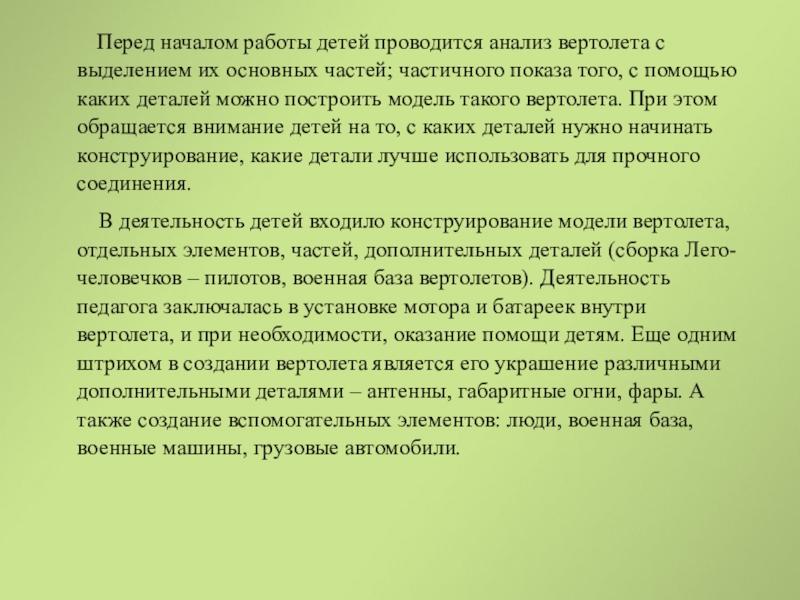 их основных частей; частичного показа того, с помощью каких деталей можно построить модель такого вертолета. При этом обращается внимание детей на то, с каких деталей нужно начинать конструирование, какие детали лучше использовать для прочного соединения.