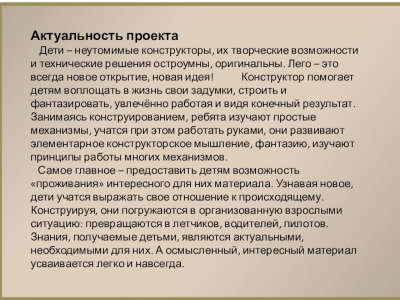 Самое главное – предоставить детям возможность «проживания» интересного для них материала. Узнавая новое, дети учатся выражать свое отношение к происходящему. Конструируя, они погружаются в организованную взрослыми ситуацию: превращаются в летчиков, водителей, пилотов. Знания, получаемые детьми, являются актуальными, необходимыми для них. А осмысленный, интересный материал усваивается легко и навсегда.