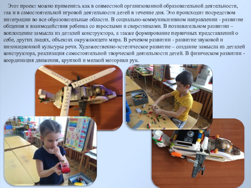 деятельности, так и в самостоятельной игровой деятельности детей в течение дня. Это происходит посредством интеграции во все образовательные области. В социально-коммуникативном направлении - развитие общения и взаимодействия ребенка со взрослыми и сверстниками. В познавательном развитии – воплощение замысла из деталей конструктора, а также формирование первичных представлений о себе, других людях, объектах окружающего мира. В речевом развитии - развитие звуковой и интонационной культуры речи. Художественно-эстетическое развитие – создание замысла из деталей конструктора, реализация самостоятельной творческой деятельности детей. В физическом развитии - координация движения, крупной и мелкой моторики рук.