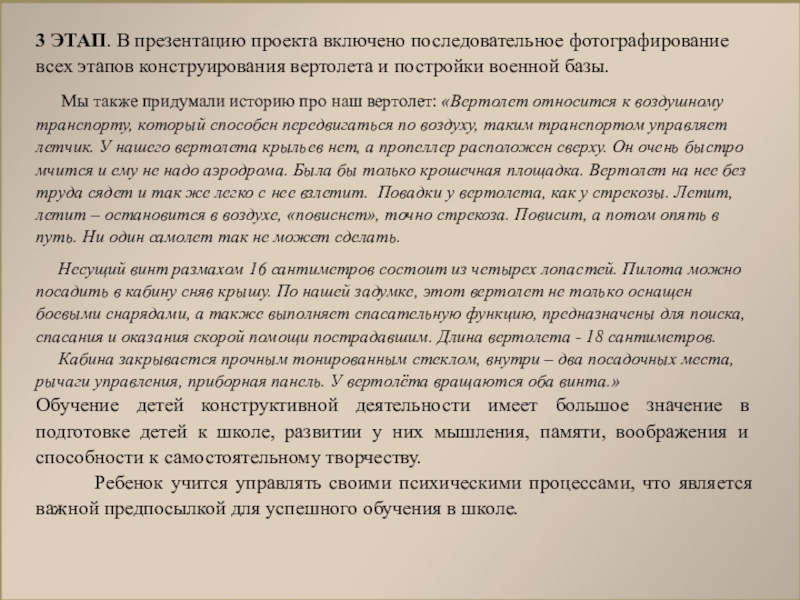 3 ЭТАП. В презентацию проекта включено последовательное фотографирование всех этапов конструирования