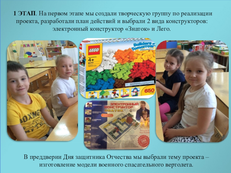 проекта, разработали план действий и выбрали 2 вида конструкторов: электронный конструктор «Знаток» и Лего.