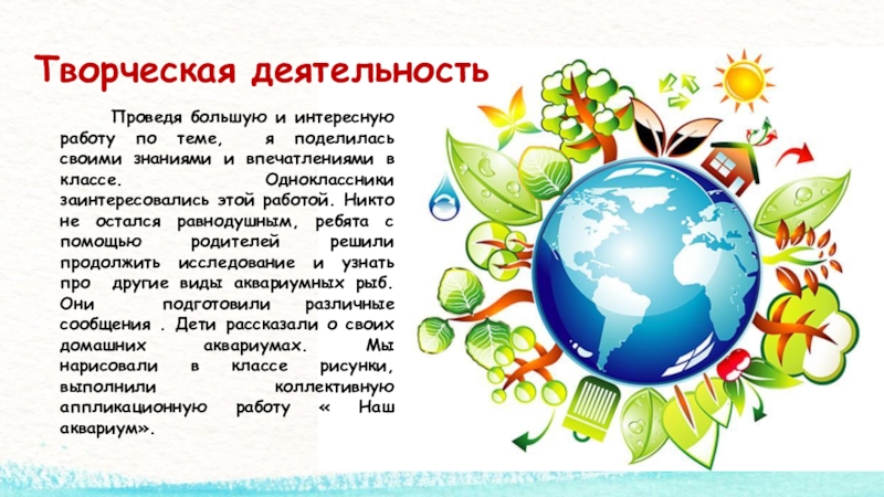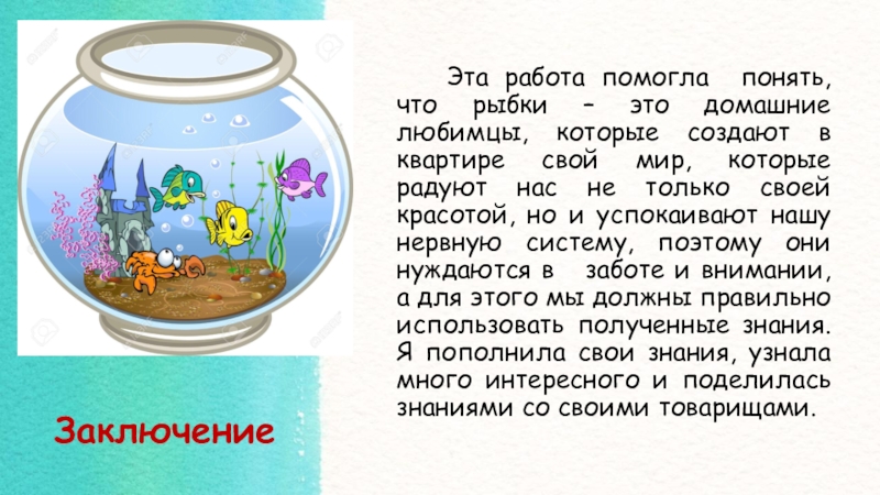 На основе собственных наблюдений, собранного материала создать копилку фактов из жизни аквариумных рыбок, приготовить сообщения о разных видах аквариумных рыб, нарисовать рисунки и выполнить аппликационную работу.