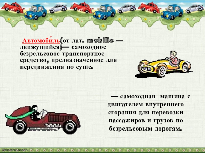— самоходная машина с двигателем внутреннего сгорания для перевозки пассажиров и грузов по безрельсовым дорогам.