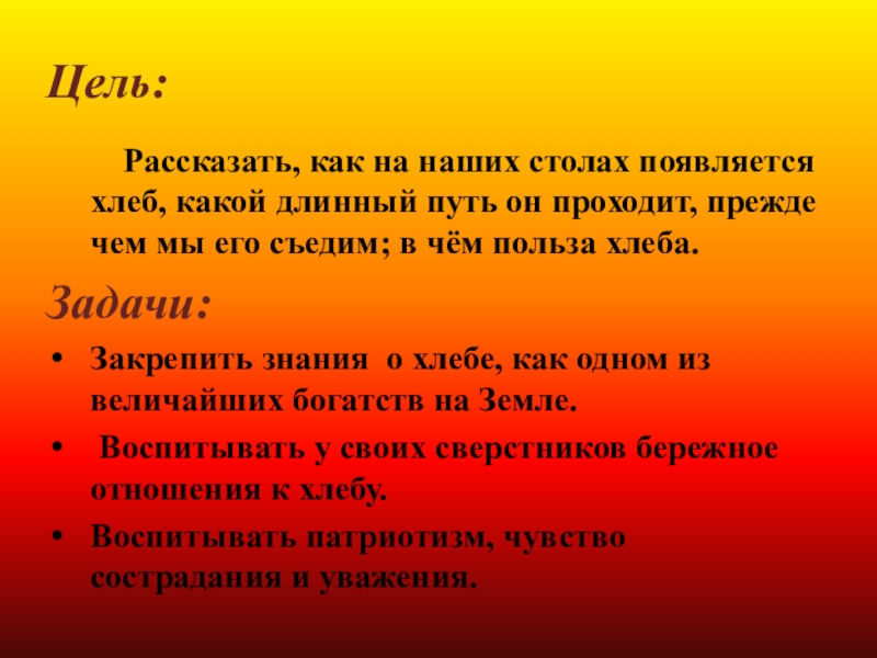 Закрепить знания о хлебе, как одном из величайших богатств на Земле.