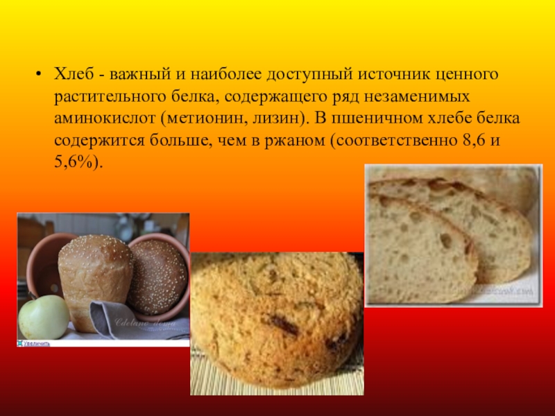 Слайд 18Хлеб - важный и наиболее доступный источник ценного растительного белка, содержащего