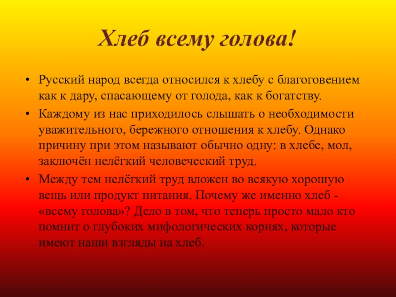Между тем нелёгкий труд вложен во всякую хорошую вещь или продукт питания. Почему же именно хлеб - «всему голова»? Дело в том, что теперь просто мало кто помнит о глубоких мифологических корнях, которые имеют наши взгляды на хлеб.