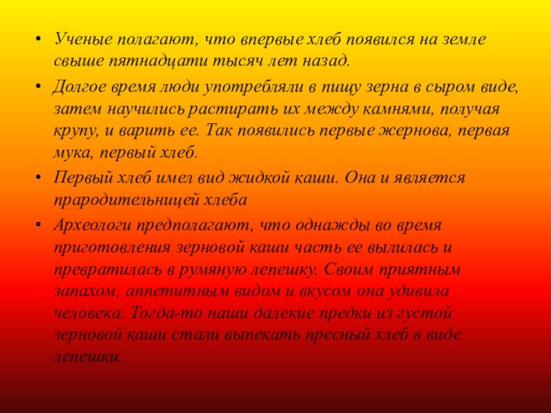 Слайд 13Ученые полагают, что впервые хлеб появился на земле свыше пятнадцати тысяч