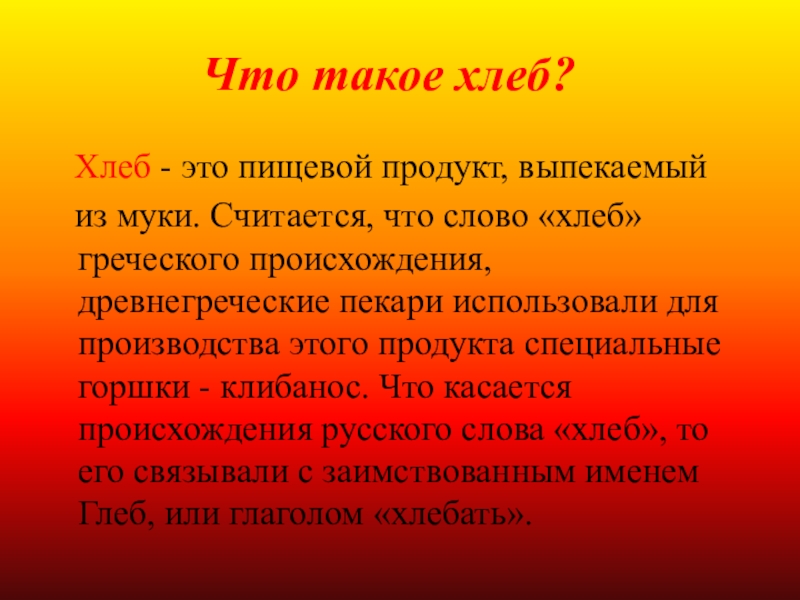 из муки. Считается, что слово «хлеб» греческого происхождения, древнегреческие пекари использовали для производства этого продукта специальные горшки - клибанос. Что касается происхождения русского слова «хлеб», то его связывали с заимствованным именем Глеб, или глаголом «хлебать».