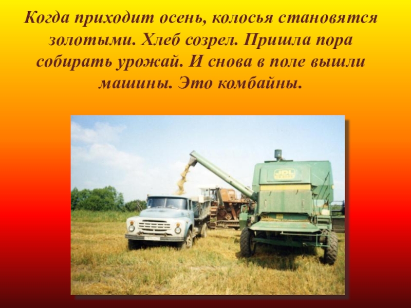 урожай. И снова в поле вышли машины. Это комбайны.