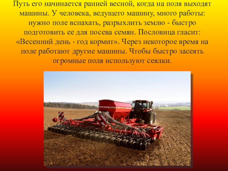 Слайд 6Путь его начинается ранней весной, когда на поля выходят машины. У