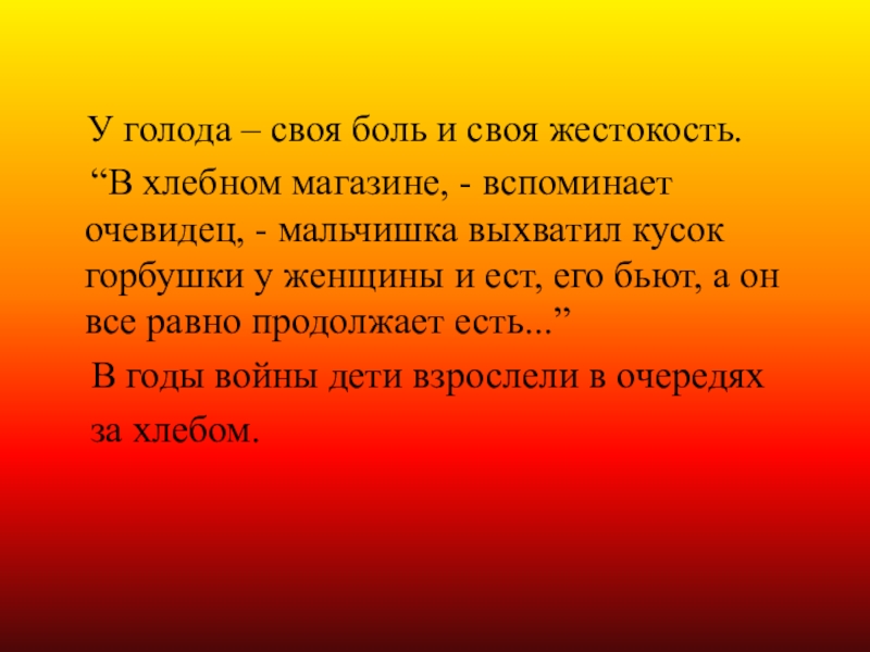 “В хлебном магазине, - вспоминает очевидец, - мальчишка выхватил кусок горбушки у женщины и ест, его бьют, а он все равно продолжает есть...”