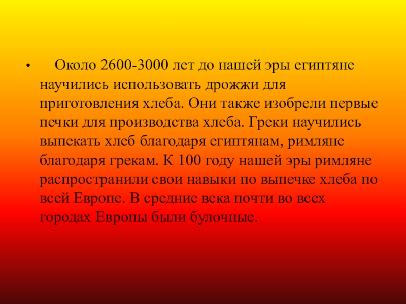 использовать дрожжи для приготовления хлеба. Они также изобрели первые печки для производства хлеба. Греки научились выпекать хлеб благодаря египтянам, римляне благодаря грекам. К 100 году нашей эры римляне распространили свои навыки по выпечке хлеба по всей Европе. В средние века почти во всех городах Европы были булочные.