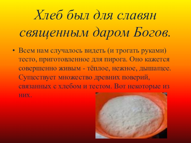 (и трогать руками) тесто, приготовленное для пирога. Оно кажется совершенно живым - тёплое, нежное, дышащее. Существует множество древних поверий, связанных с хлебом и тестом. Вот некоторые из них.