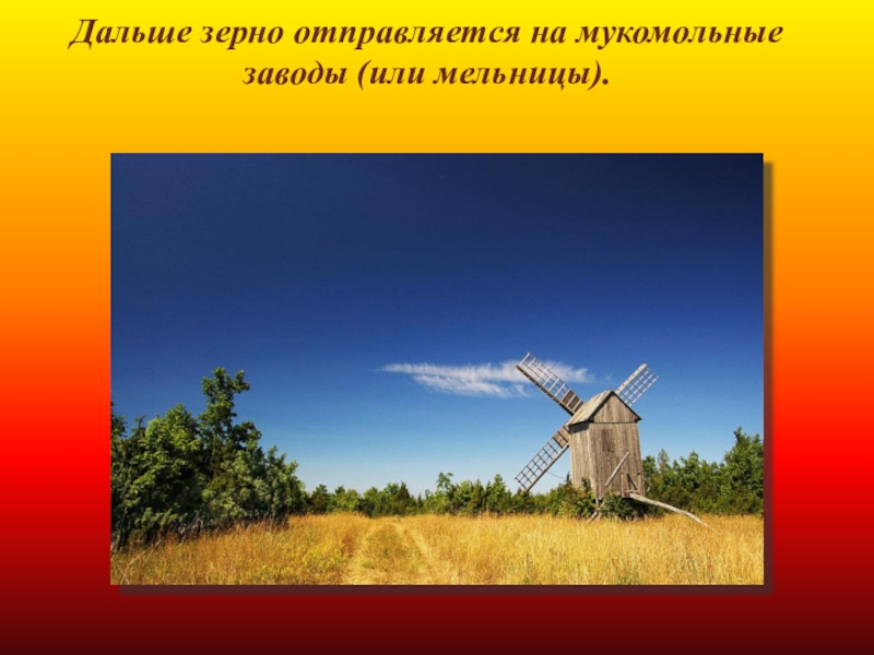 Слайд 9Дальше зерно отправляется на мукомольные заводы (или мельницы).