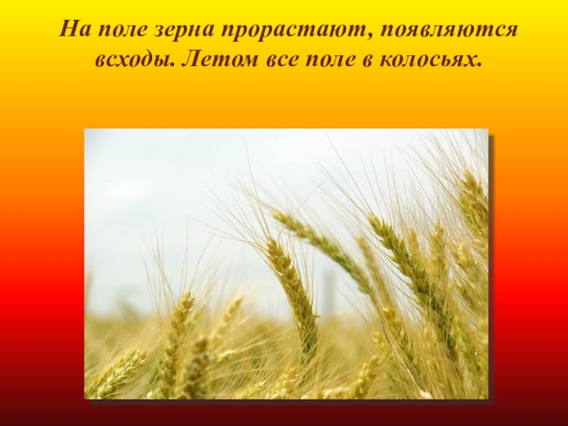 Слайд 7На поле зерна прорастают, появляются всходы. Летом все поле в колосьях.
