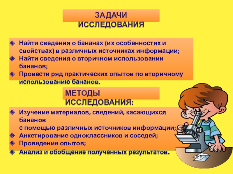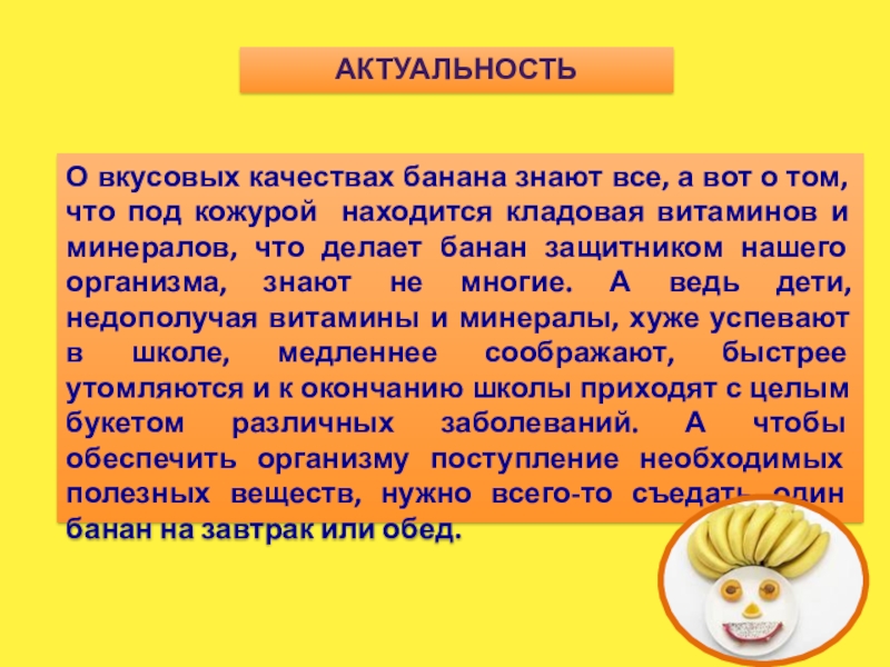ПРЕДМЕТ исследования: пищевая ценность бананов, возможность вторичного использования бананов.