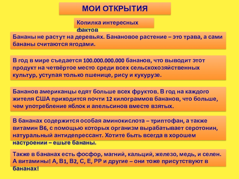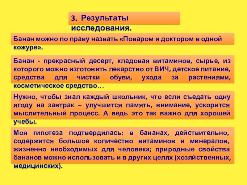 Моя гипотеза подтвердилась: в бананах, действительно, содержится большое количество витаминов и минералов, жизненно необходимых для человека; природные свойства бананов можно использовать и в других целях (хозяйственных, медицинских).