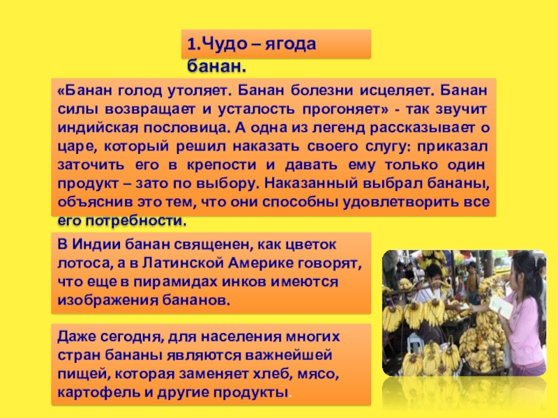Даже сегодня, для населения многих стран бананы являются важнейшей пищей, которая заменяет хлеб, мясо, картофель и другие продукты.