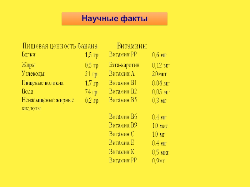 Также в бананах есть фосфор, магний, кальций, железо, медь, и селен. А витамины! А, В1, В2, С, Е, РР и другие – они тоже присутствуют в бананах!