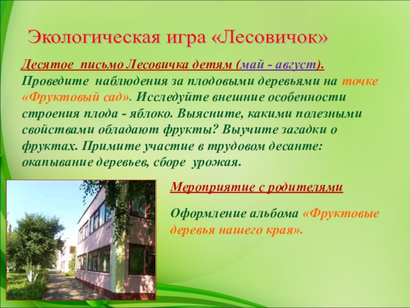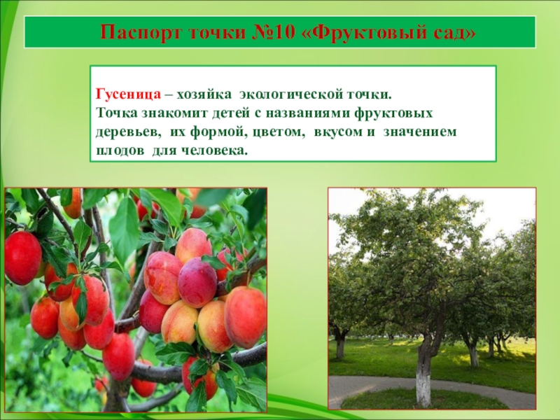Точка знакомит детей с названиями фруктовых деревьев, их формой, цветом, вкусом и значением плодов для человека.