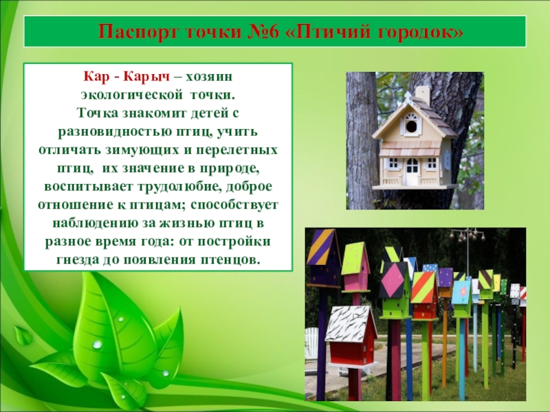 Точка знакомит детей с разновидностью птиц, учить отличать зимующих и перелетных птиц, их значение в природе, воспитывает трудолюбие, доброе отношение к птицам; способствует наблюдению за жизнью птиц в разное время года: от постройки гнезда до появления птенцов.