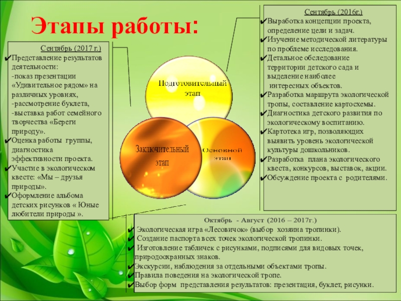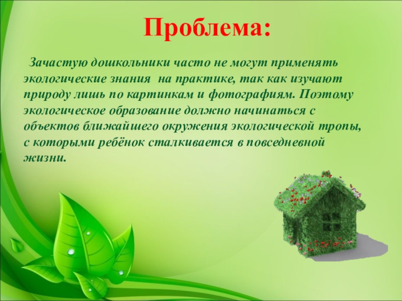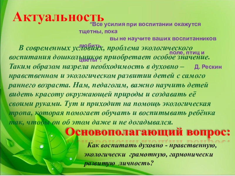 В современных условиях, проблема экологического воспитания дошкольников приобретает особое значение. Таким образом назрела необходимость в духовно – нравственном и экологическом развитии детей с самого раннего возраста. Нам, педагогам, важно научить детей видеть красоту окружающей природы и создавать её своими руками. Тут и приходит на помощь экологическая тропа, которая помогает обучать и воспитывать ребёнка так, чтобы он об этом даже и не догадывался.