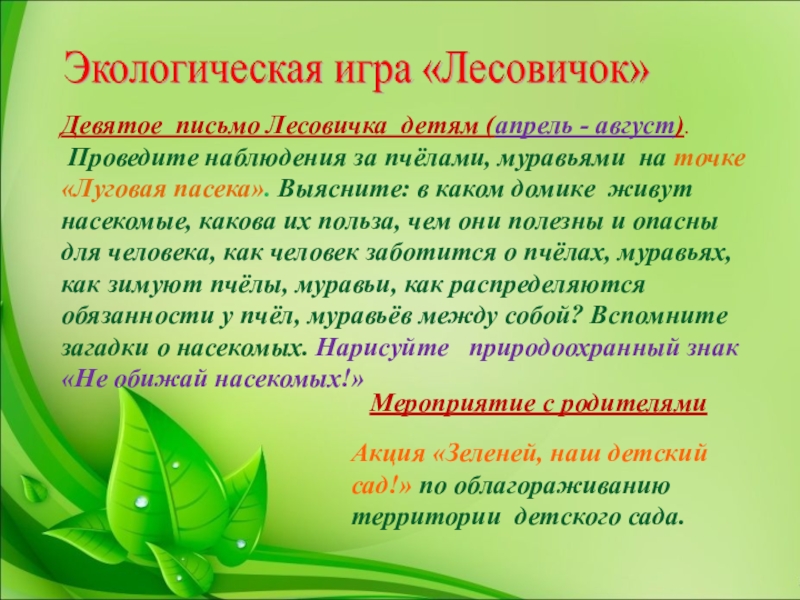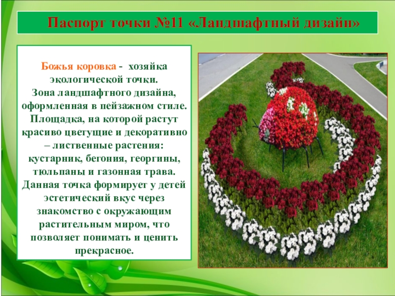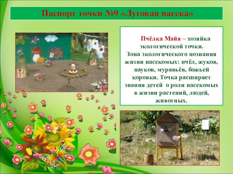 Зона экологического познания жизни насекомых: пчёл, жуков, пауков, муравьёв, божьей коровки. Точка расширяет знания детей о роли насекомых в жизни растений, людей, животных.