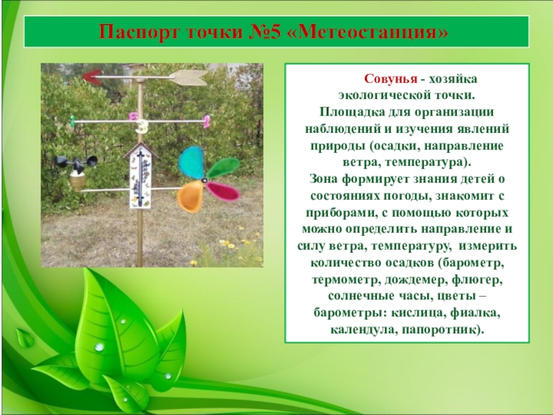 Зона формирует знания детей о состояниях погоды, знакомит с приборами, с помощью которых можно определить направление и силу ветра, температуру, измерить количество осадков (барометр, термометр, дождемер, флюгер, солнечные часы, цветы – барометры: кислица, фиалка, календула, папоротник).