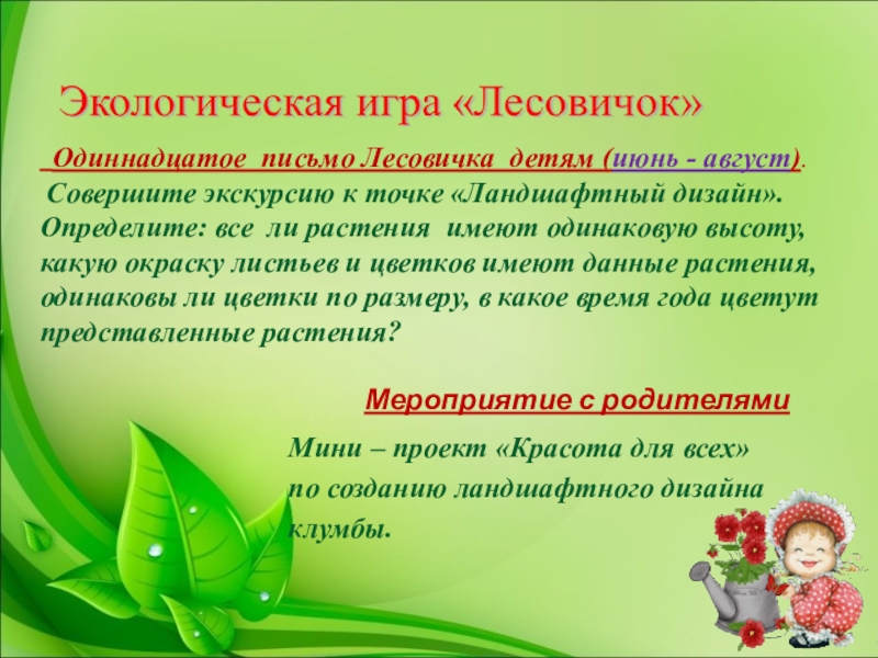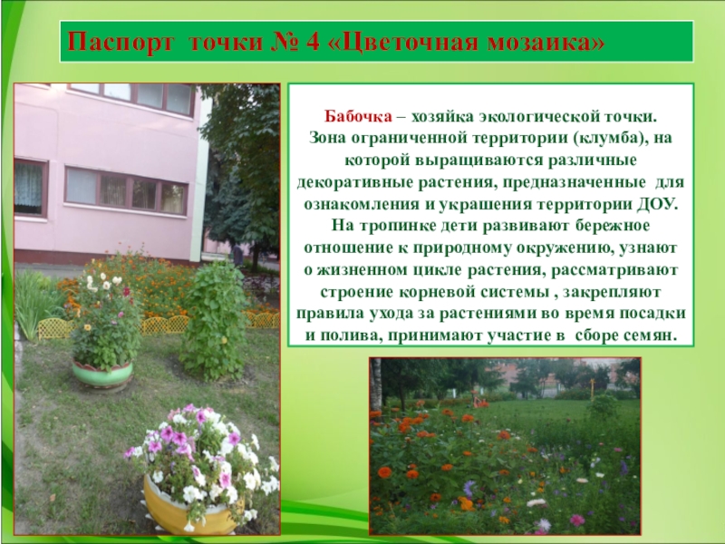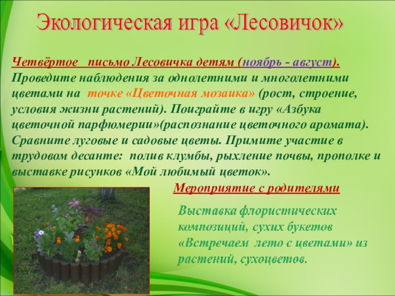 Проведите наблюдения за однолетними и многолетними цветами на точке «Цветочная мозаика» (рост, строение, условия жизни растений). Поиграйте в игру «Азбука цветочной парфюмерии»(распознание цветочного аромата). Сравните луговые и садовые цветы. Примите участие в трудовом десанте: полив клумбы, рыхление почвы, прополке и выставке рисунков «Мой любимый цветок».