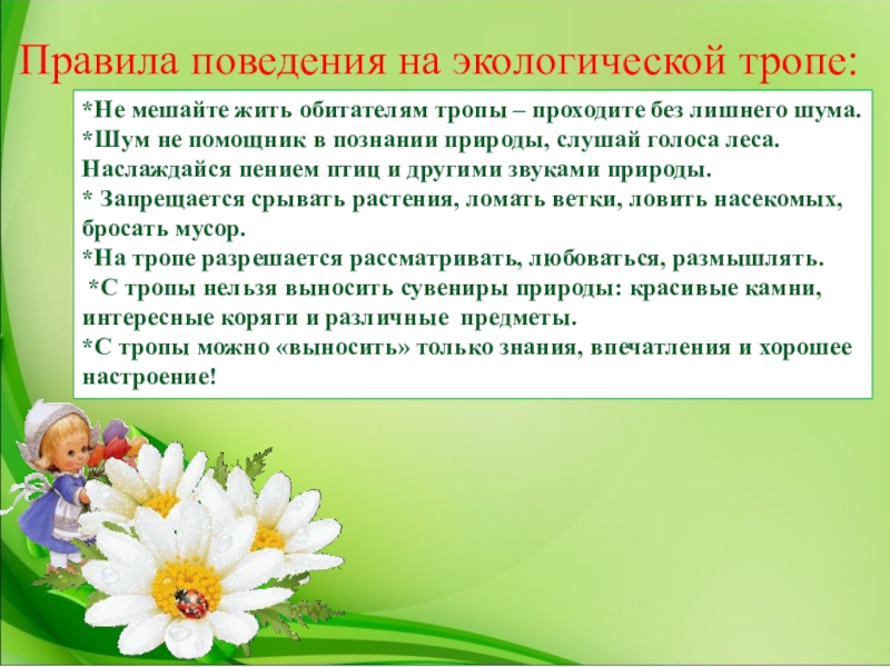 Экскурсии, наблюдения за отдельными объектами тропы.