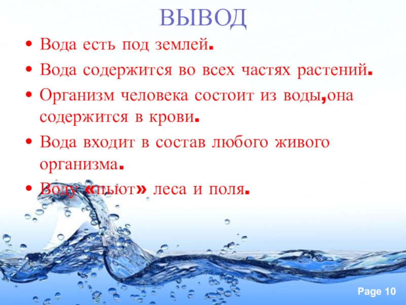 ВЫВОДВода есть под землей.Вода содержится во всех частях растений.Организм человека состоит из воды,она содержится в крови.Вода входит