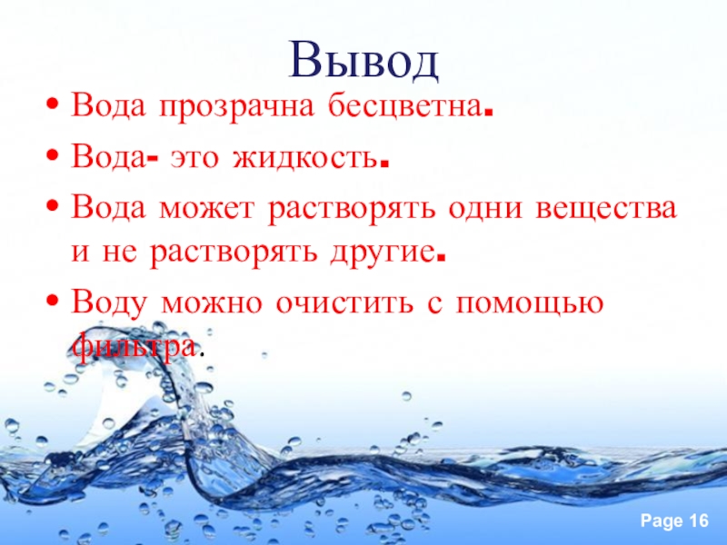 ВыводВода прозрачна бесцветна.Вода- это жидкость.Вода может растворять одни вещества и не растворять другие.Воду можно очистить с помощью