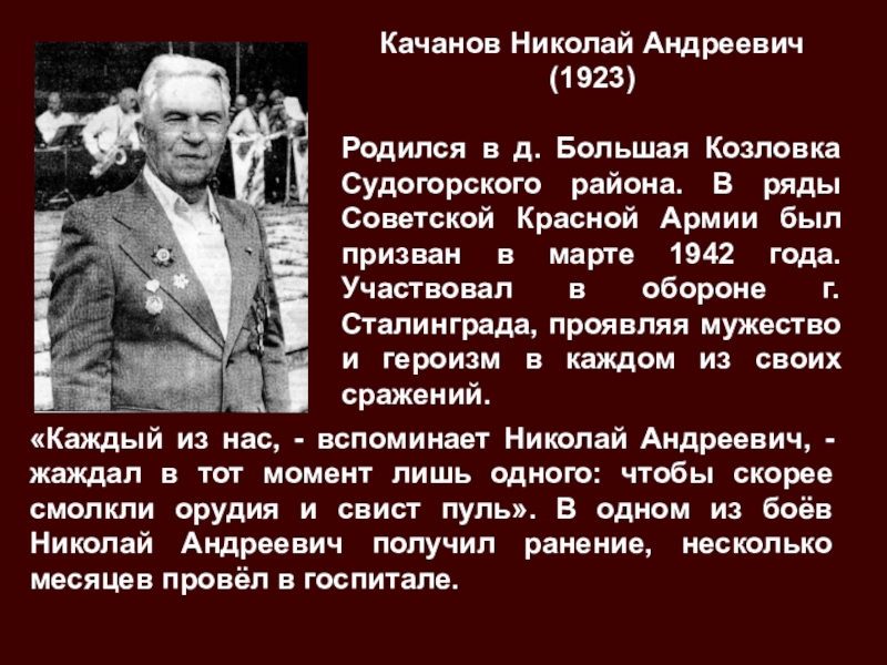 «Каждый из нас, - вспоминает Николай Андреевич, - жаждал в тот момент лишь одного: чтобы скорее смолкли орудия и свист пуль». В одном из боёв Николай Андреевич получил ранение, несколько месяцев провёл в госпитале.