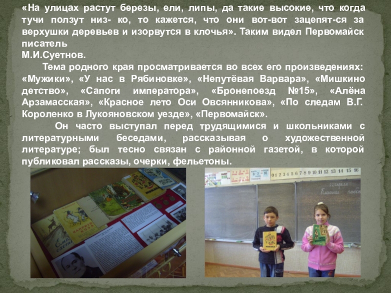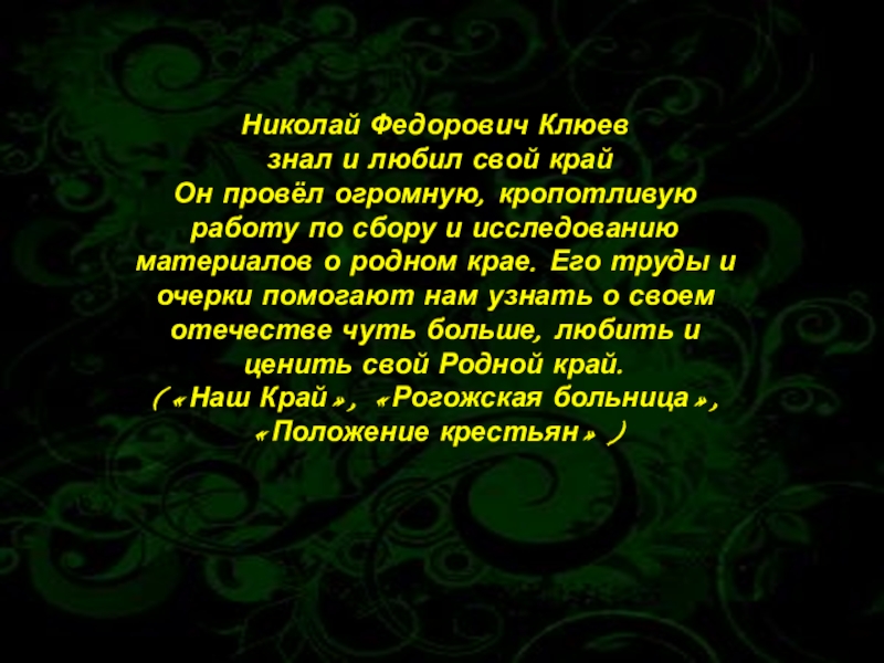работу по сбору и исследованию материалов о родном крае. Его труды и очерки помогают нам узнать о своем отечестве чуть больше, любить и ценить свой Родной край.