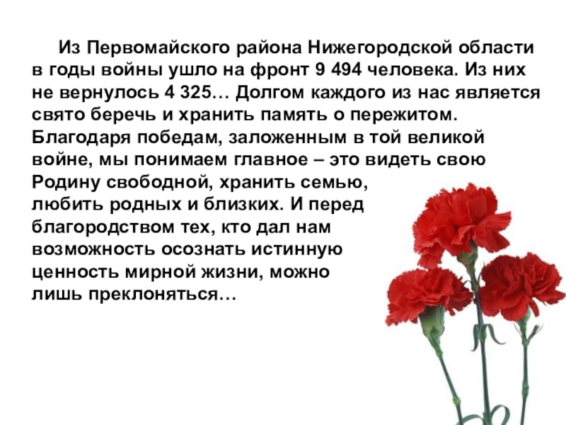 ушло на фронт 9 494 человека. Из них не вернулось 4 325… Долгом каждого из нас является свято беречь и хранить память о пережитом. Благодаря победам, заложенным в той великой войне, мы понимаем главное – это видеть свою Родину свободной, хранить семью,