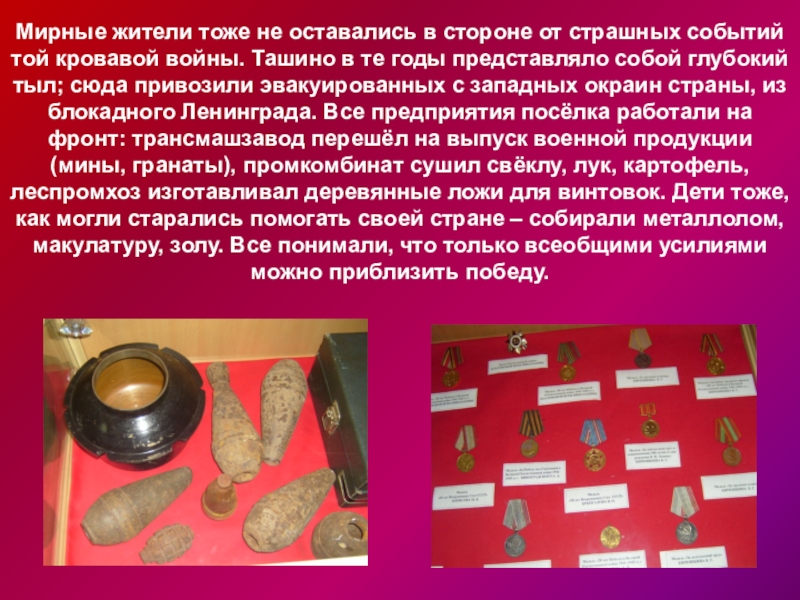 кровавой войны. Ташино в те годы представляло собой глубокий тыл; сюда привозили эвакуированных с западных окраин страны, из блокадного Ленинграда. Все предприятия посёлка работали на фронт: трансмашзавод перешёл на выпуск военной продукции (мины, гранаты), промкомбинат сушил свёклу, лук, картофель, леспромхоз изготавливал деревянные ложи для винтовок. Дети тоже, как могли старались помогать своей стране – собирали металлолом, макулатуру, золу. Все понимали, что только всеобщими усилиями можно приблизить победу.