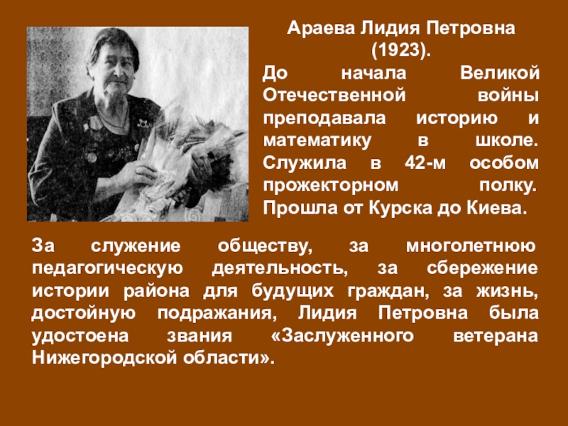 За служение обществу, за многолетнюю педагогическую деятельность, за сбережение истории района для будущих граждан, за жизнь, достойную подражания, Лидия Петровна была удостоена звания «Заслуженного ветерана Нижегородской области».