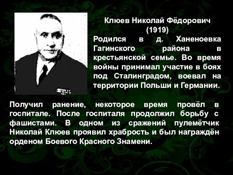 Получил ранение, некоторое время провёл в госпитале. После госпиталя продолжил борьбу с фашистами. В одном из сражений пулемётчик Николай Клюев проявил храбрость и был награждён орденом Боевого Красного Знамени.
