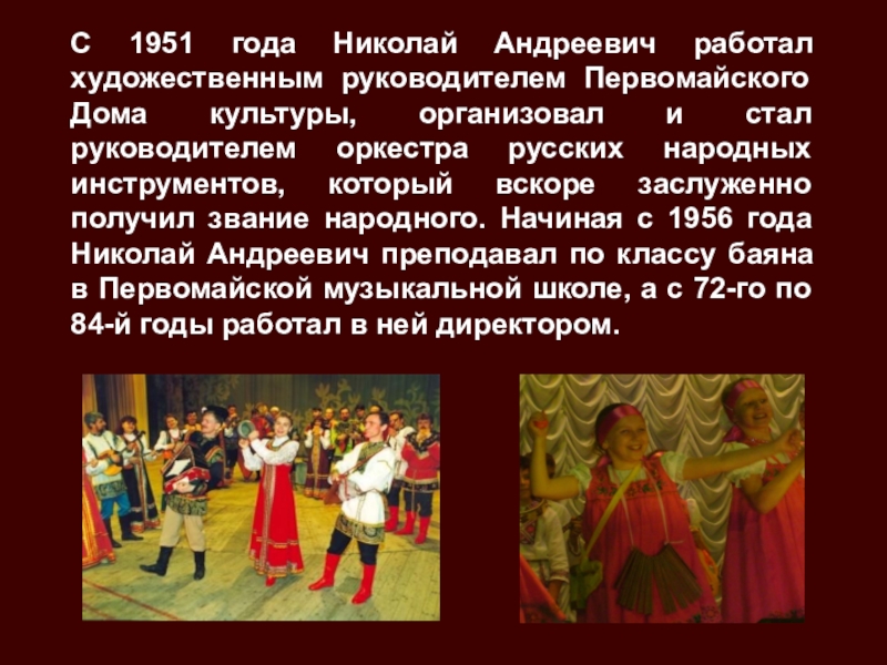 Слайд 12С 1951 года Николай Андреевич работал художественным руководителем Первомайского Дома культуры,